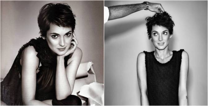 7. The short haircut perfectly emphasizes the facial features and the slender figure of Winona Ryder.