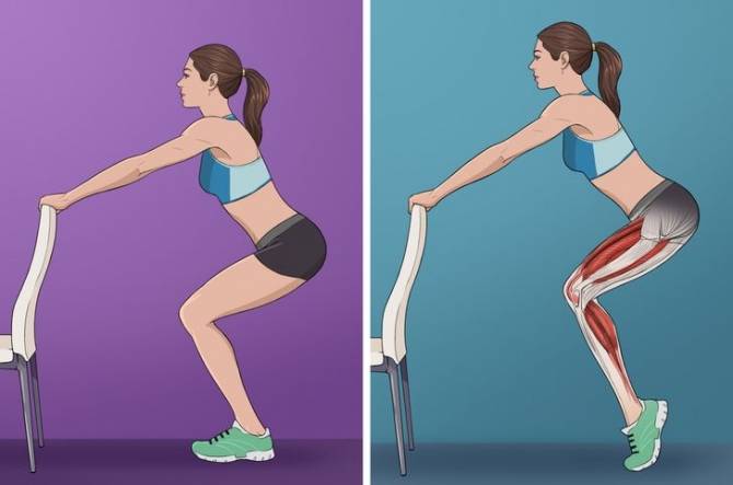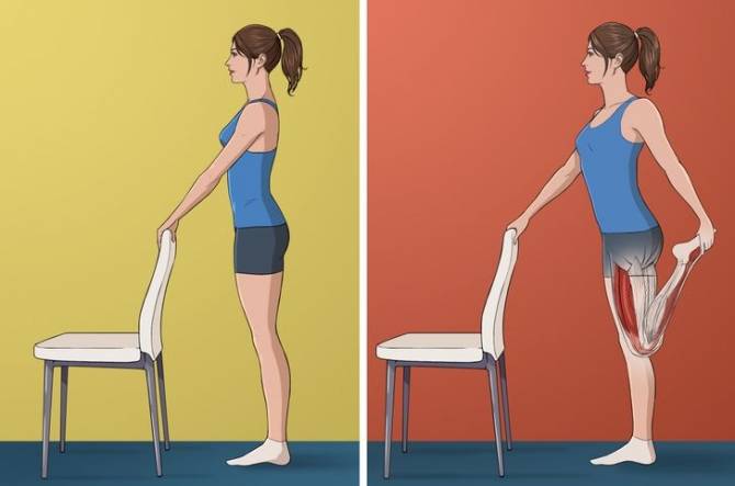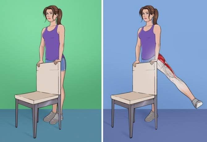 Stand behind the chair, place your feet shoulder-width apart, slightly bend your knees, and lean on the chair back.