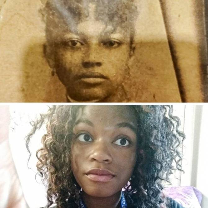 13. `Top - my great-grandmother, daughter of a slave, in 1887, bottom - me, a university student`