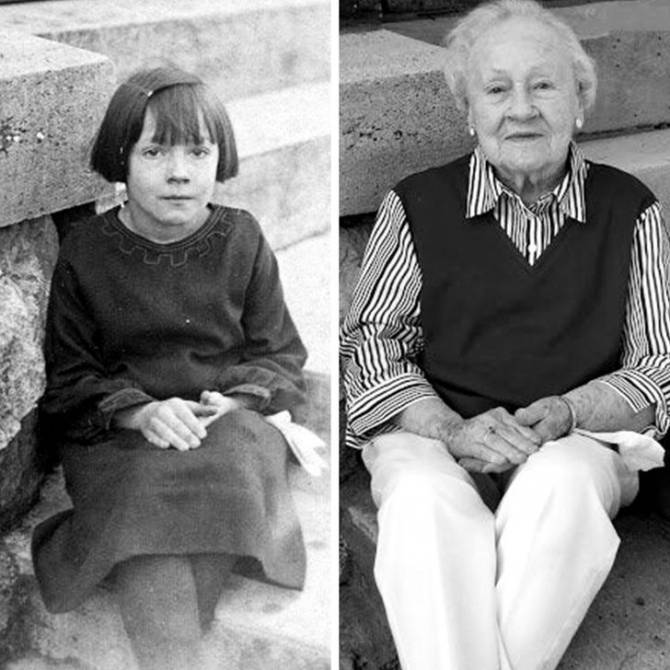 5. `This is my grandfather with his sister at his 80th birthday. They`re sitting on the same bench as in the old photo 72 years ago`