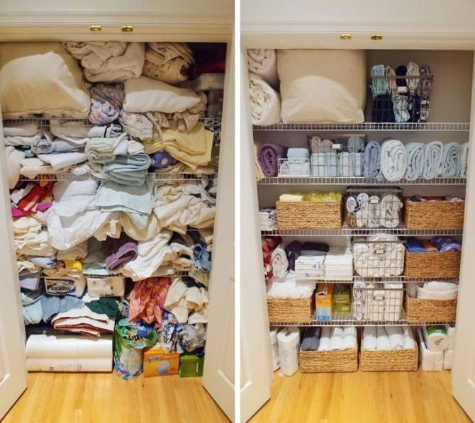 Bedroom closet before and after organizing according to Marie Kondos method