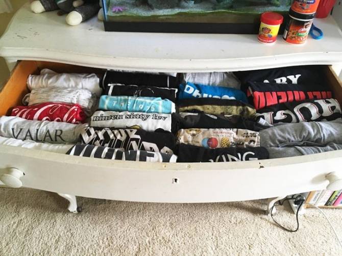 If shirts are stored rolled up, space is saved, and you can immediately see what you have