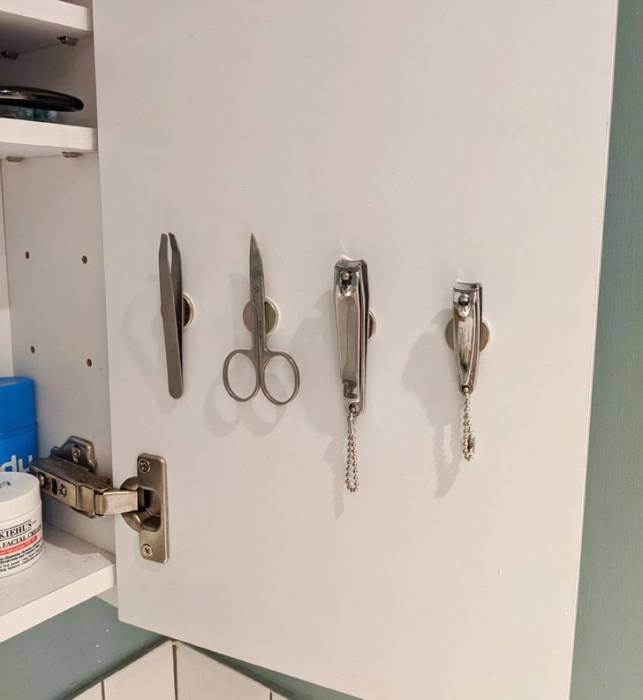 Attach magnets to the cabinet door and scissors/tweezers will never get lost