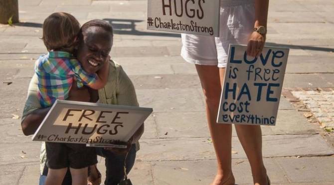 3. Emotional photo where a 3-year-old son hugs his father after the devastating earthquake in Charleston.