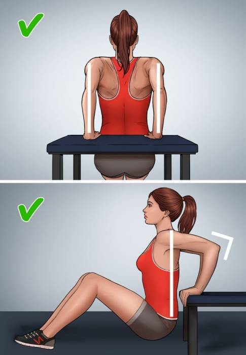 • Slowly lower your body using arm strength. At the end, elbows should be at 90 degrees. Then push off from the bench and return to the starting position.
