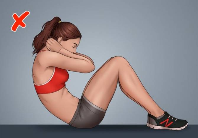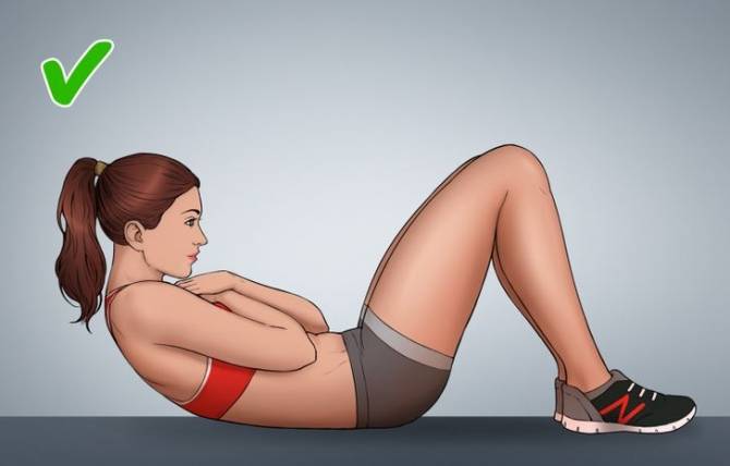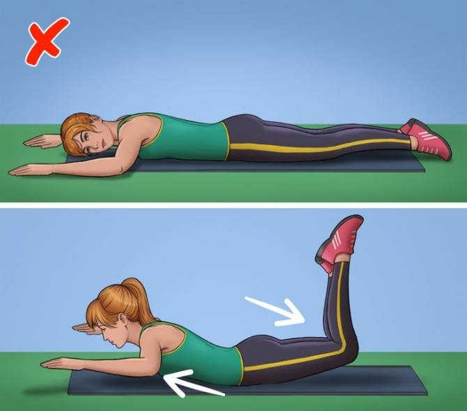 • Arching the lower back reduces the load on the abs, harms the knees, and can cause pain in the lumbar region.
