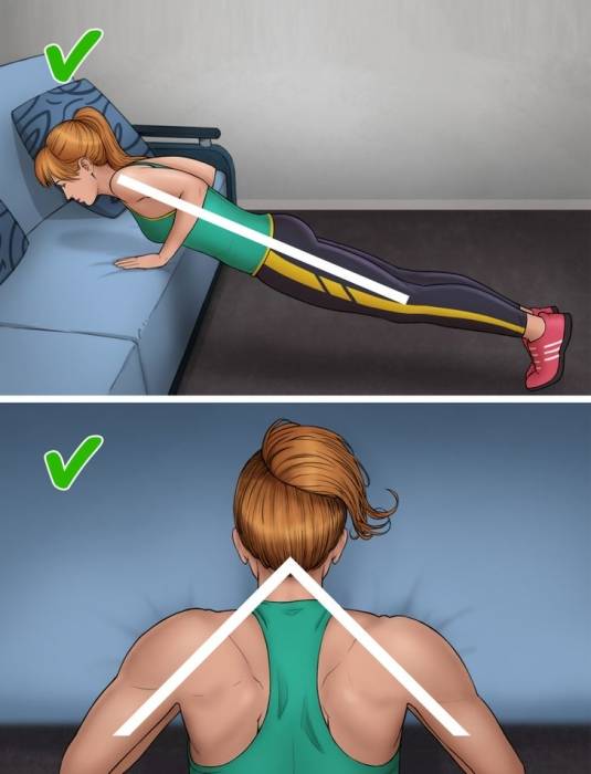 Studies show that the easy push-up version uses the same target muscles but without extra load. It can be push-ups from knees or toes, but from a wall, bench, sofa.