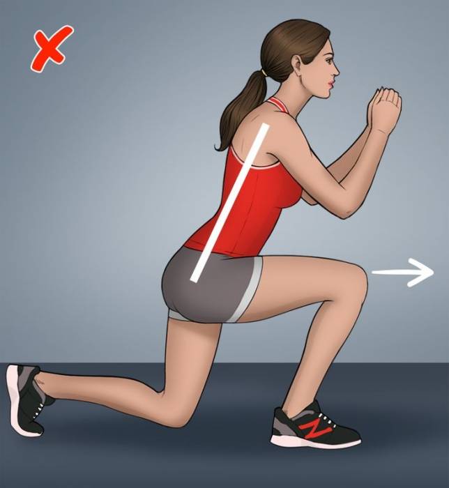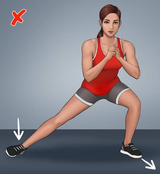 • The front leg`s knee extends beyond the toe line. This leads to uneven load distribution and goes to the front thigh surface, disengaging the glutes from work.