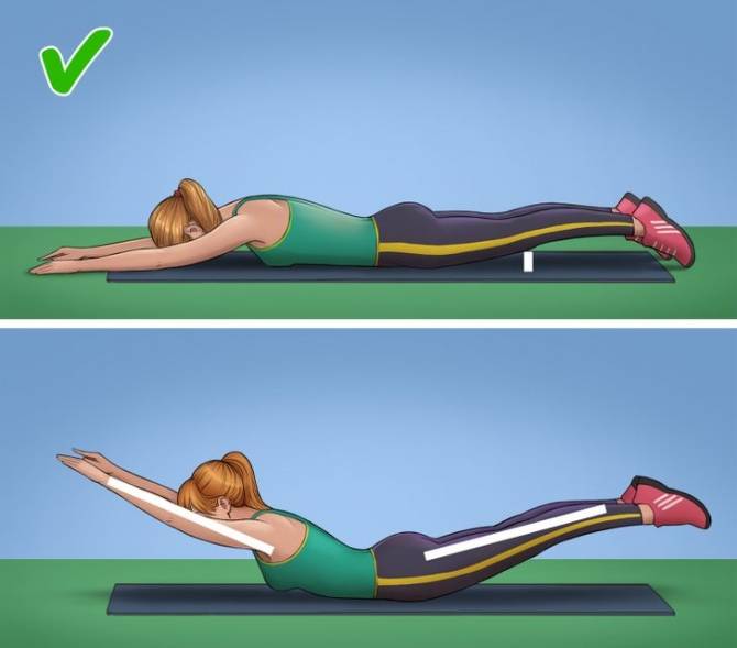 • Starting position: lie face down, extend arms and legs as much as possible. Tense hips so that knees don`t touch the floor.