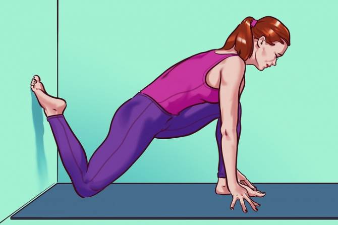 • Push off with your toes against the wall and bend your knee. The other leg stands fully on the floor (without lifting the heel).
