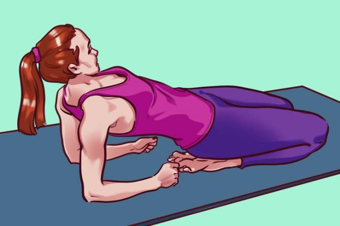 • Lie on your stomach, then lift your shoulders and cross your arms under your chest.