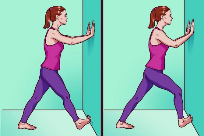 Static exercise for thighs, shins, and feet. This stretch helps remove swelling and relieves pain from walking in high heels.