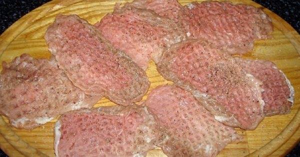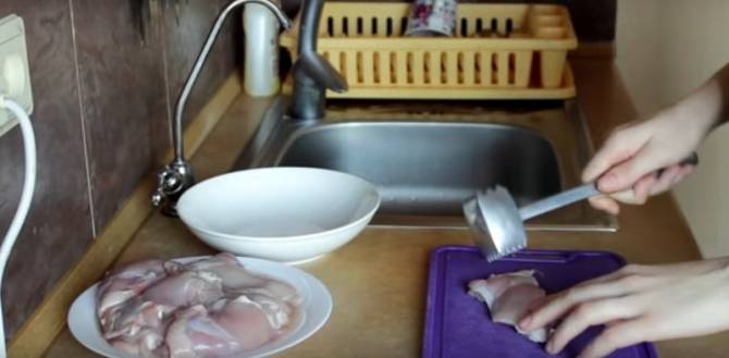 1. Cut the chicken fillet into thin slices and pound with a good hammer. Wash each piece thoroughly.