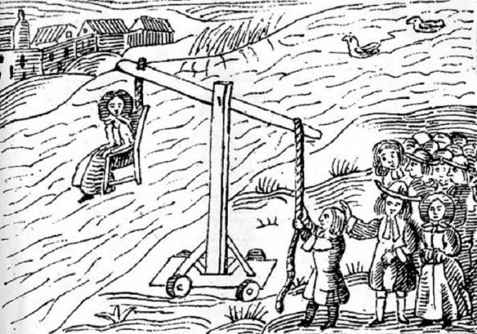 The construction was cunning: a wooden beam for support, with the chair and woman tied to one side, and ropes on the other, which were pulled to submerge the body in water or pull it out.