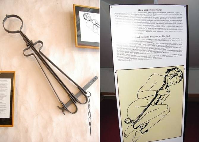 This is a fairly simple torture device. It completely locked the victim, preventing movement. Women were locked in shackles, their legs bent, and knees pressed to the chest. In this way, the body quickly went numb, and the unfortunate one began to feel hellish pains spreading from the waist throughout the body. Often, such a test drove them mad within a couple of days.