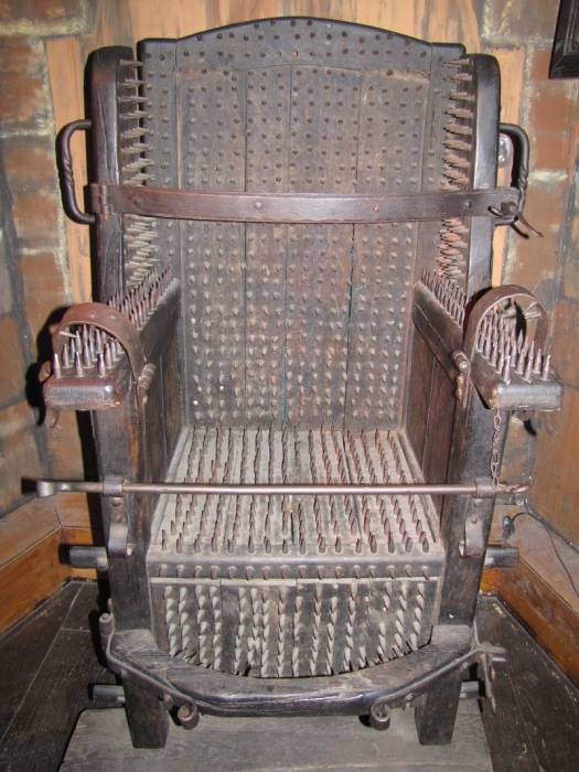 A horrifying invention - the `witch`s chair` or `Inquisition chair`. It looked like a chair with arm irons and spikes that lightly pierced the flesh.
