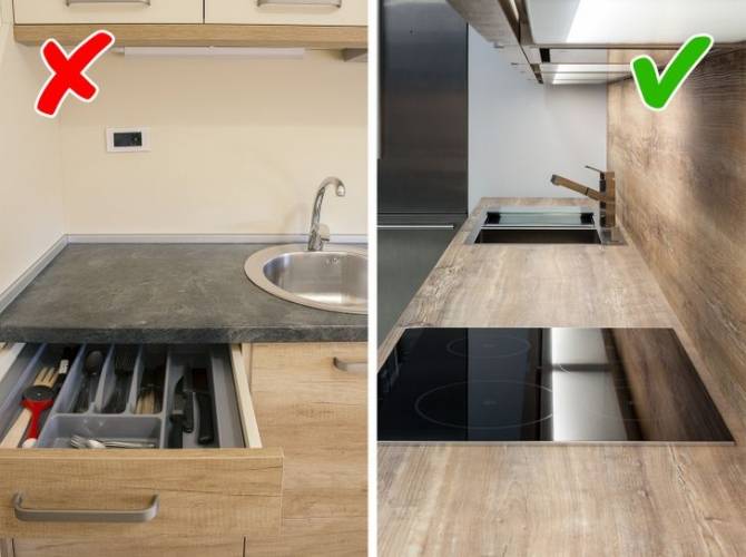 It`s time to forget this greeting from the early 2000s, but it`s still very common in kitchen interiors. Modern fashion trends insist that there is no border between the wall and the countertop. The connection between them is so tight that it makes the seam invisible.