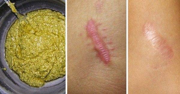 The prepared mixture should be applied to the scar twice a day. On top apply a plaster or secure the ointment on the damaged area with a gauze bandage. The procedure should be done for one month but the result will be noticeable after two weeks.