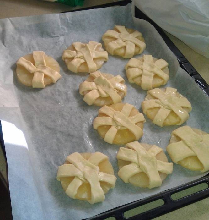 2. Wrap each pineapple ring with dough strips as in the photo and place on a baking sheet (don`t forget the baking paper).