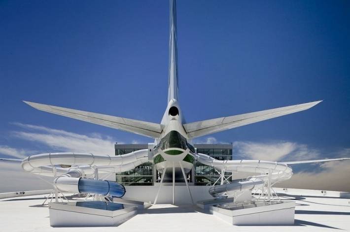 Boeing 747 Aviation Museum in Oregon water slides on the plane`s roof