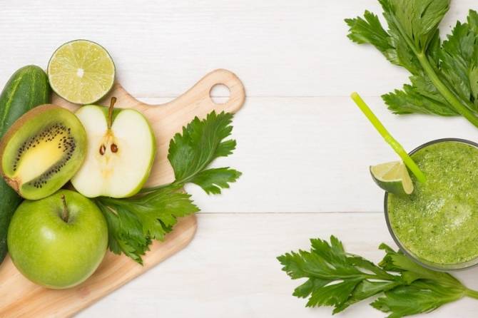 Cucumber, green apple, 50 g celery stalks, kiwi, and a few mint leaves blended together. This smoothie enhances lymph flow, activates stomach and intestinal tract activity. If desired, you can add flaxseeds.